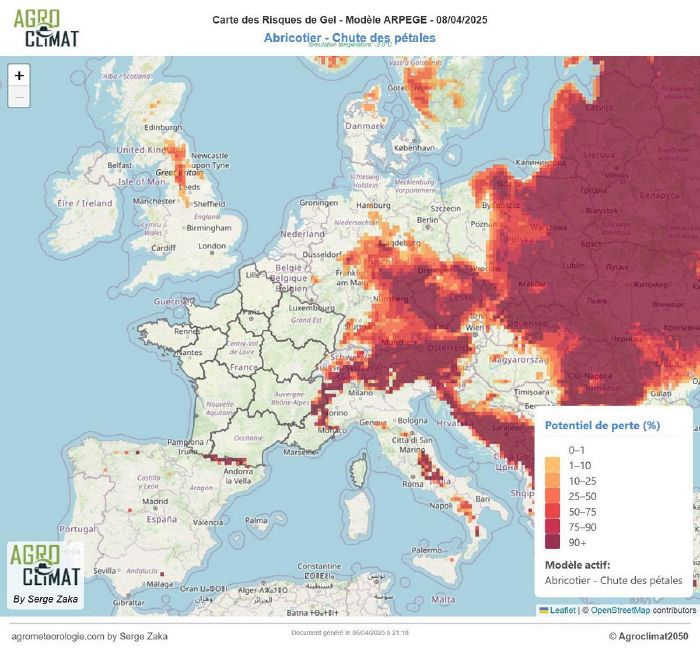 L'outil propose les pertes de fleurs dues au gel, à une résolution de 1,3 km² sur toute la France, et de 5 à 12 km² sur l’ensemble de l’Europe.