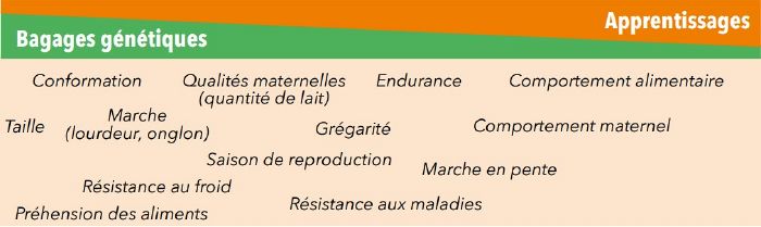Il semble impossible de séparer les aptitudes, qui seraient déterminées par la génétique, et les compétences, qui seraient acquises durant la vie de l’animal. Les deux facteurs coexistent et forment les caractéristiques du troupeau (compétences alimentaires, physiologie digestive, niveau de production, etc.). Certaines semblent plus liées au bagage génétique des animaux, et d’autres semblent davantage dépendre des pratiques.