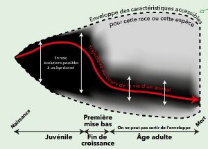 Le schéma ci-contre illustre, pour un animal, une race ou une espèce donné : son potentiel génétique fini ("enveloppe des caractéristiques accessibles pour cette race ou cette espèce") ainsi que la trajectoire prise au cours de sa vie en fonction des pratiques de l’éleveur et de ses objectifs. )