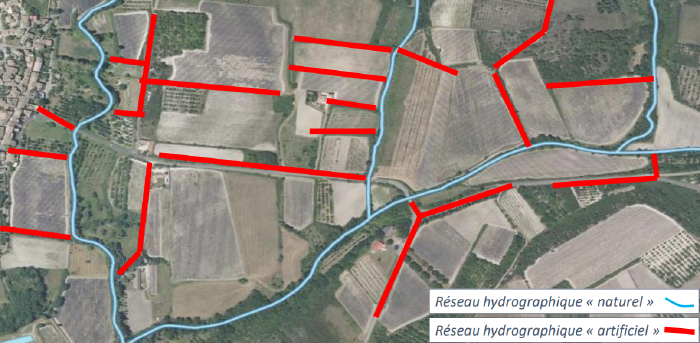 • Réseau hydrographique : Ensemble des cours d’eau permanents (traits bleus continus sur les cartes) ou intermittents (traits pointillés) s’écoulant sur un territoire donné. Les cours d’eau intermittents peuvent être dus à des sources saisonnières ou à l’écoulement des eaux de précipitation dans les talwegs.