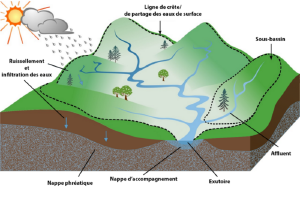 • Bassin versant : Défini comme l’unité de base de la gestion de l’eau, c’est un territoire qui draine l’ensemble des eaux vers un exutoire commun. Les bassins versants existent à différentes échelles, des petites parcelles aux grandes façades continentales. Ils sont délimités par des lignes de crête ou lignes de partage des eaux. On distingue le bassin versant (eaux de surface et souterraines) du bassin hydrographique (uniquement les eaux de surface formant le réseau hydrographique). Chaque grand bassin versant est composé de multiples sous-bassins.