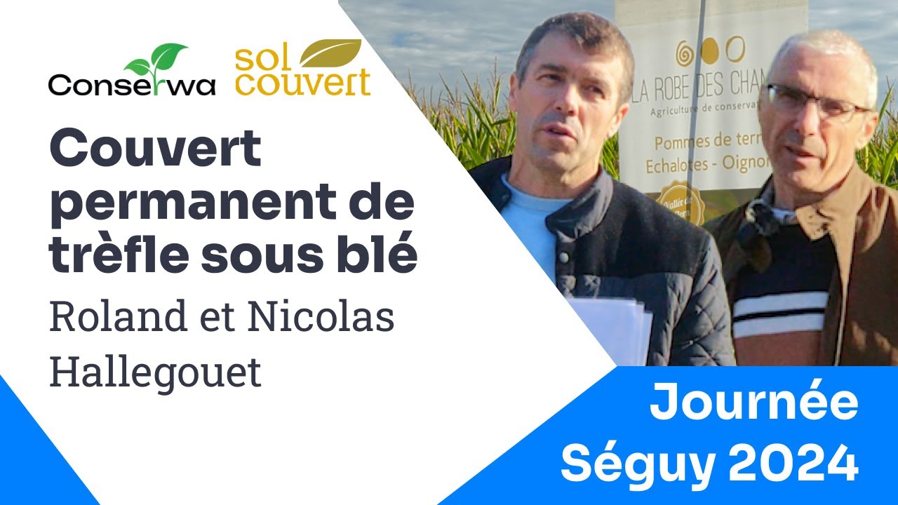 En septembre 2024, pendant la journée technique Lucien Séguy, Roland et Nicolas Hallegouet, agriculteurs dans le Finistère en Bretagne, nous on présenté leur système agricole. Ils nous explique comment ils ont réussi à mettre en place l'agriculture de conservation sur leur ferme tout en conservant leur production de pommes de terre. Depuis plusieurs années, ils mettent en place un couvert de trèfle blanc sous leur blé.