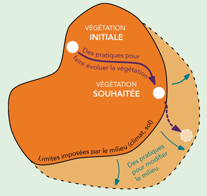 - Un premier niveau consiste à choisir ses pratiques pour faire évoluer la végétation avec pour limite les conditions du milieu. On attend un changement dans le développement de la végétation (nanification, reproduction) ou dans sa composition spécifique (survie).