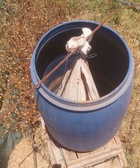 Baril accueillant un sac de fumier et de l'eau pour fertiliser la culture d'Azolla.
