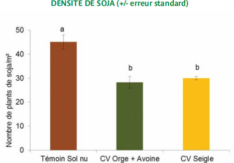 On observe une diminution de la densité de pied de soja pour les modalités avec un couvert en précédent. La forte biomasse produite par le couvert végétal qui a été détruit au rouleau cambridge a pu gêner le semis réalisé fin mai en semis direct sous couvert végétal et donc la germination et/ou la croissance initiale du soja. Des repousses de couverts végétaux (détruits mécaniquement uniquement) ont également pu faire de la concurrence.
