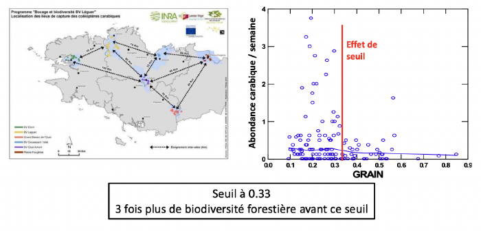 Un effet de seuil a été observé : la présence d’espèces forestières devient significative lorsque le grain bocager est inférieur à 0,33, mais cela n’est efficace que si la qualité des haies est également bonne.