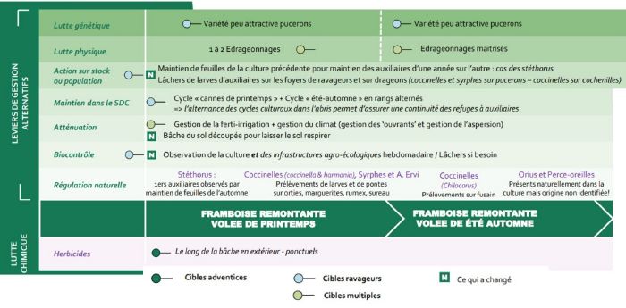 Valorisation et maintien des infrastructures agro-écologiques en périphérie de l’abri de production : les orties (par exemple) abritent des pucerons qui leur sont spécifiques mais qui attirent des auxiliaires utiles à la culture de framboise. En maitrisant le développement de « spots » à orties l’agriculteur prélève les auxiliaires dont il a besoin pour les relâcher sur sa culture dès l’apparition des premiers pucerons.