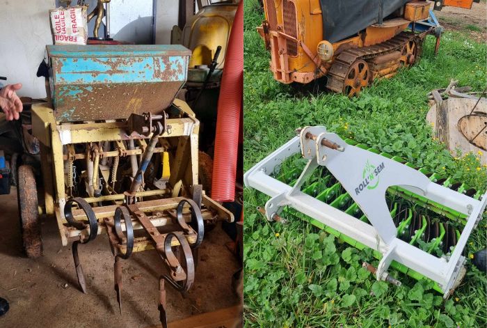- Pour la mise en place des couverts , Olivier a acheté d’occasion un semoir de 2m de large sur lequel il a rajouté à l’avant, des dents pour créer des sillons et à l’arrière des chaînes pour refermer ces sillons.