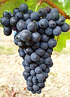 Grappes moyennes, ailées lui donnant une forme pyramidale, compactes, pédoncules forts avec une partie lignifiée; baies petites à moyennes irrégulières, ovoïdes ou légèrement de forme elliptique pointue, peau noir bleuté recouverte d'une belle pruine non persistante. Le point pétiolaire de la feuille est de couleur légèrement rose.
