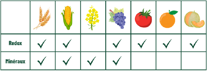 - Minéraux et oligo-éléments : Azote (total et ammonium), cuivre, calcium, molybdène, potassium, fer, soufre, silicium, chlore, magnésium, zinc, phosphore. Le manganèse et le bore sont en cours de calibrage.
