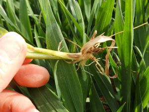 Une seule tache (rarement deux) est observée, avec des bords faiblement marqués, et présente souvent sous le premier nœud. Verse possible à maturité en cas de forte attaque.