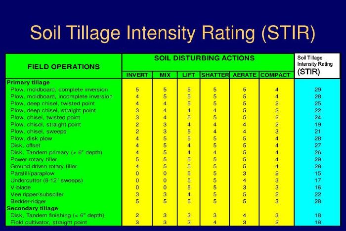 Par exemple, un labour conventionnel (STIR > 120) est considéré comme plus perturbateur qu’un semis direct avec des couverts hivernants diversifiés (STIR < 60)[3].