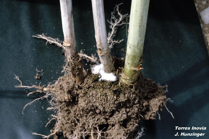 Sur tige : tâche ou manchon de couleur blanchâtre, se développe à l’aisselle des feuilles.