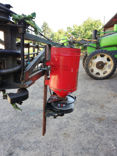 Le semoir est entraîné par la seconde prise de force de la moissonneuse. Réglage par cannelures, distribution par éclateurs. Fixation sur une assise métallique soudée à la coupe.