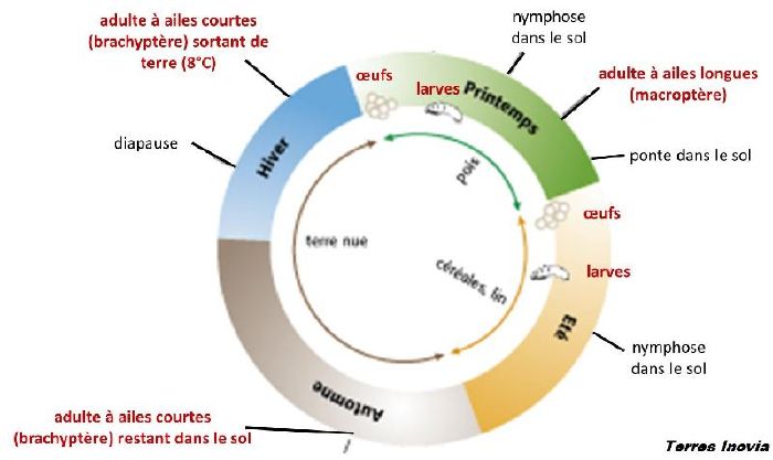 Les dégâts ont quasiment toujours été observés lorsque les pois ont une levée lente liée à de mauvaises conditions climatiques. En cas de levée rapide, il semble que l’on peut se dispenser d’intervenir. Un précédent blé ou lin est favorable à la présence du thrips dans la parcelle. A l’inverse, un précédent maïs ou betterave limite l’infestation.