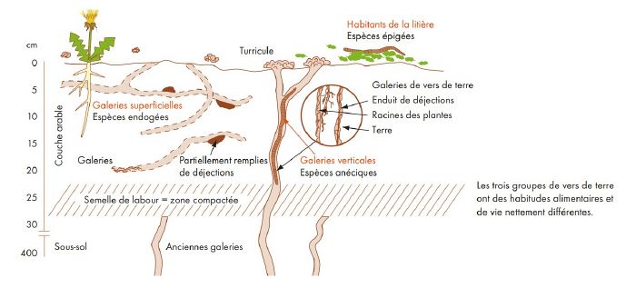 - Les espèces endogées creusent des galeries horizontales dans les 10 à 30 cm supérieurs du sol. Elles excrètent la terre digérée dans leurs galeries.